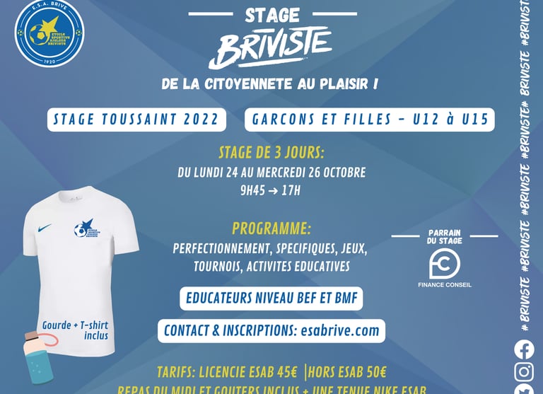 Du lundi 24 au mercredi 26 Octobre, l'ESA Brive organise son stage 100% foot. Durant trois jours les enfants se retrouveront de 9h45 à 17h au Stade Pestourie afin de pratiquer deux séances par jours. Le stage aura un tarif de 45€ pour les licenciés de l'ESAB et de 50€ pour les non-licenciés. Ce tarif comprendra les 3 repas du midi, les 3 gouters, un t-shirt d'entrainement NIKE ainsi que l'encadrement du stage (éducateurs diplômés BEF et BMF, ainsi que des joueurs passés par des centre de formation).