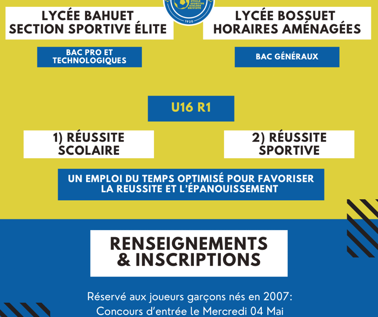 La section sportive sera au lycée Bahuet, où il sera possible de faire un Bac Pro ou Technologique ainsi que la seconde générale. Pour les élèves souhaitant s’orienter sur un cursus général, il sera possible de le suivre depuis le lycée Bossuet tout en bénéficiant d’horaires aménagées permettant de pratiquer les séances avec les élèves de Bahuet.