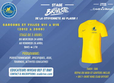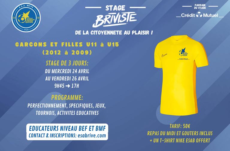 Du mercredi 24 au vendredi 26 avril, l'ESA Brive organise son stage 100% foot. Durant trois jours les enfants se retrouveront de 9h45 à 17h au Stade Pestourie afin de pratiquer deux séances par jours. Le stage aura un tarif de 50€ qui comprendra les 3 repas du midi, les 3 gouters, un t-shirt d'entrainement NIKE ainsi que l'encadrement du stage (éducateurs diplômés BEF et BMF, ainsi que des joueurs passés par des centre de formation).
