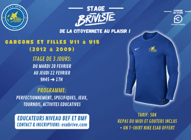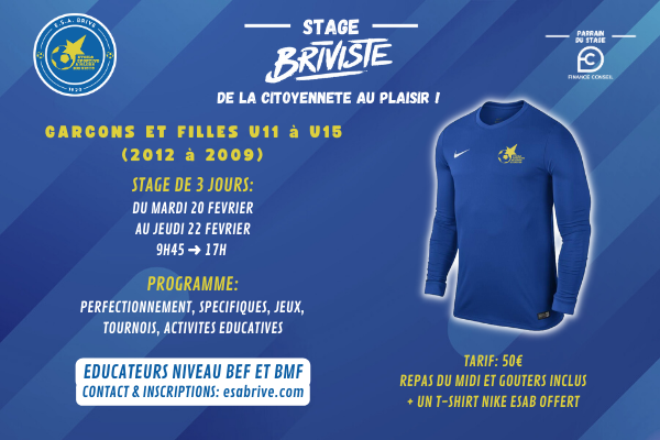 Du mardi 20 au jeudi 22 février, l'ESA Brive organise son stage 100% foot. Durant trois jours les enfants se retrouveront de 9h45 à 17h au Stade Pestourie afin de pratiquer deux séances par jours. Le stage aura un tarif de 50€ qui comprendra les 3 repas du midi, les 3 gouters, un t-shirt d'entrainement NIKE ainsi que l'encadrement du stage (éducateurs diplômés BEF et BMF, ainsi que des joueurs passés par des centre de formation).