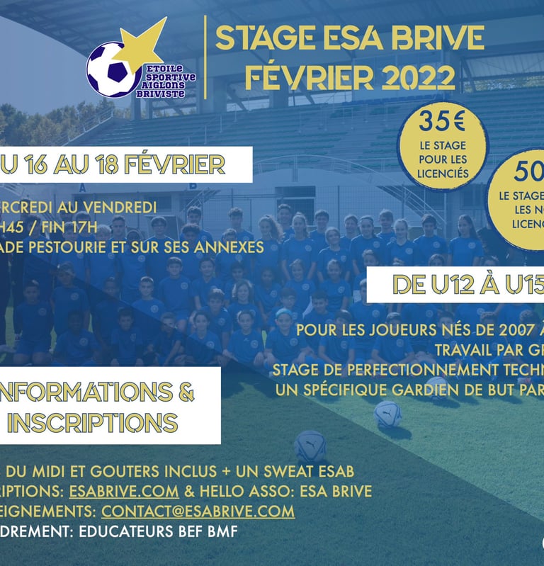 Du mercredi 15 au vendredi 18 Février, l'ESA Brive organise son stage 100% foot. Durant trois jours les enfants se retrouveront de 9h45 à 17h au Stade Pestourie afin de pratiquer deux séances par jours.